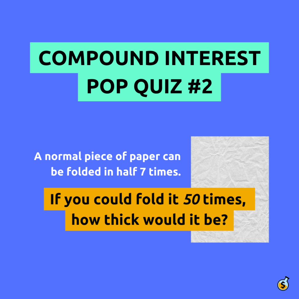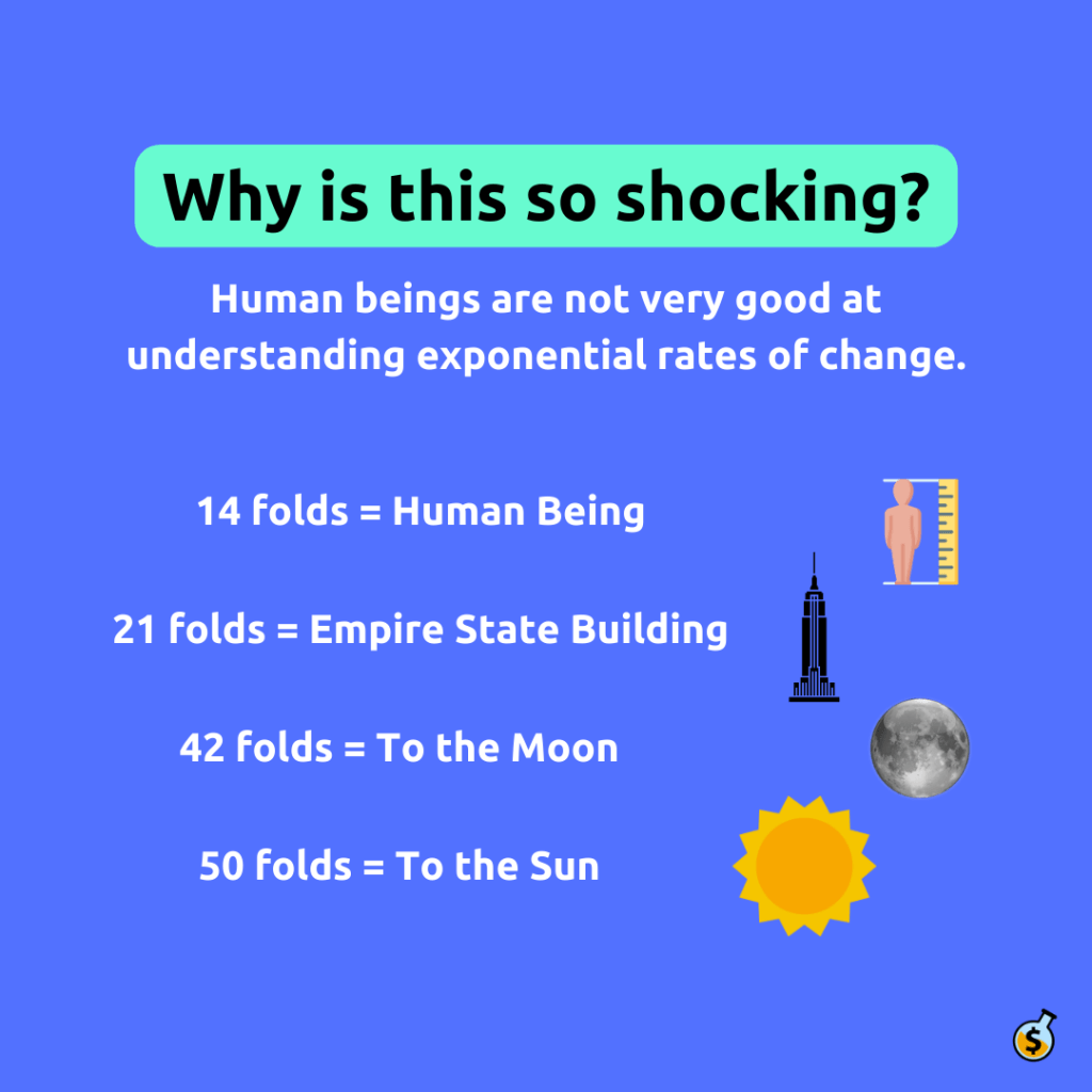 Grab a normal sized sheet of paper. 8.5 x 11, to be exact (or follow along in your imagination).Fold it in half.Now fold it in half again.Keep folding it in half until you can’t anymore.You should be able to fold it in half 7 times, before it’s no longer possible. Look at how thick it is. Perhaps an inch or two?