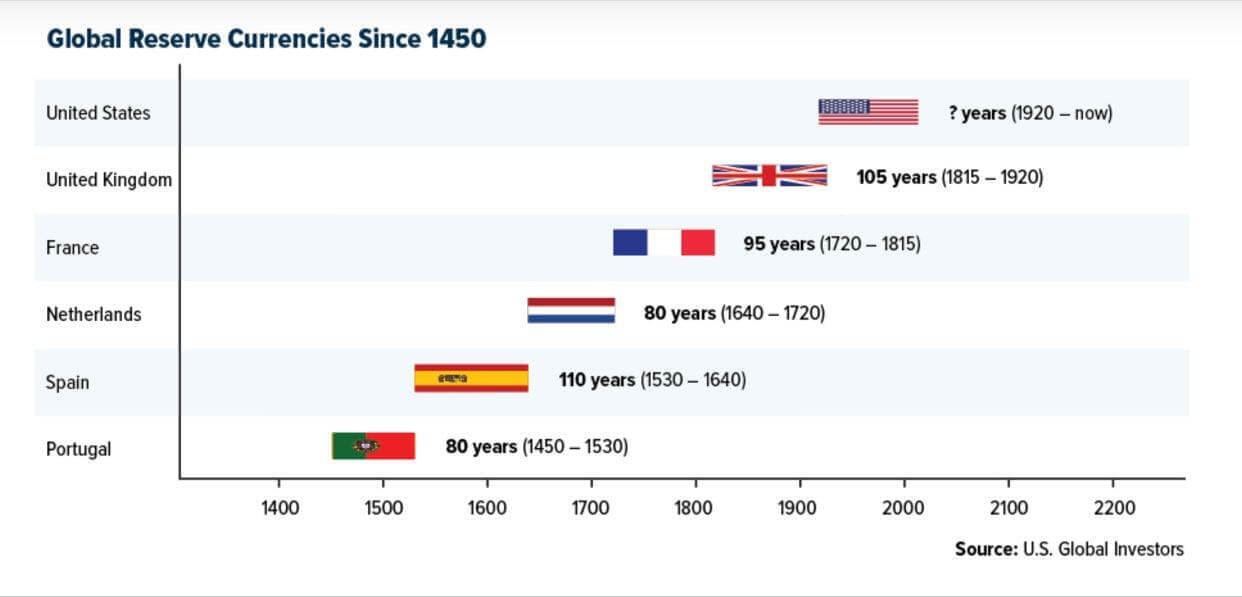 And last but not least, I’ll leave you with this chart, showing the lifespan of world reserve currencies in recent centuries: