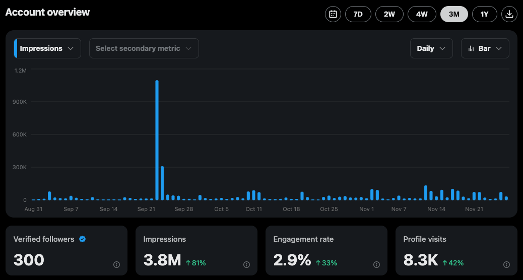 To achieve X monetization, yes I need 1.2M more impressions in the next ~20 days… but I forgot to account for the impressions that will drop off the chart on the left.