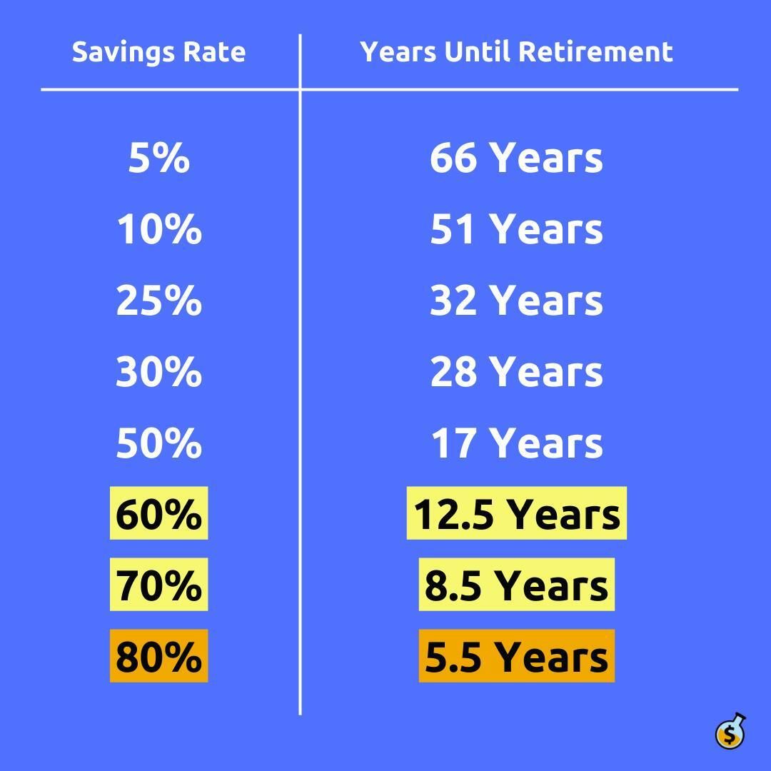 Most people underestimate just how powerful their savings rate is. In fact, the % of your post-tax income that you save is the single most important factor in determining when you can retire: