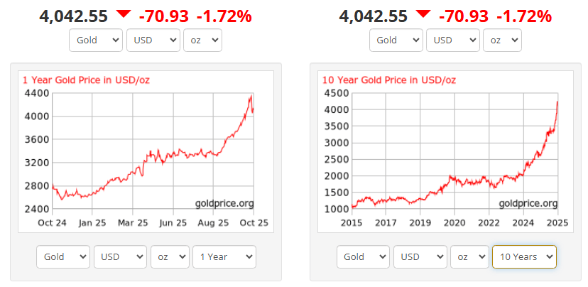 The 1Y and 10Y charts for the price of gold look equally parabolic.