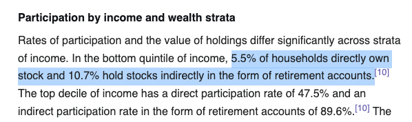 In the bottom 20% of income-earners in the US, only 5.5% directly own stocks.