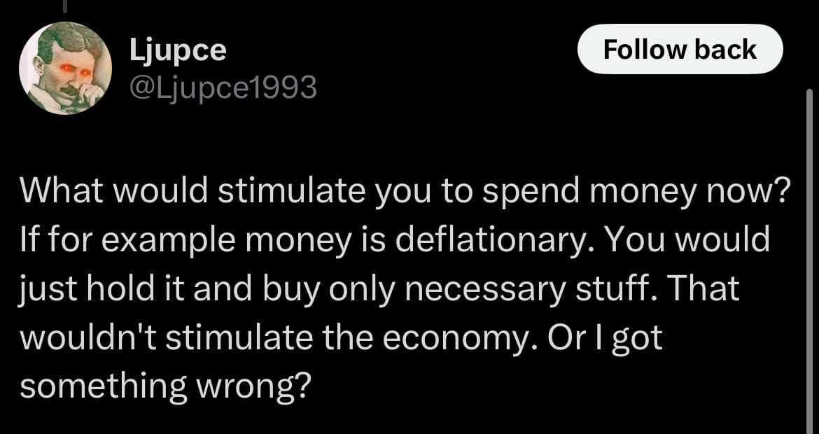 “If money is deflationary, you would just hold it and buy only necessary stuff” someone replies on X.