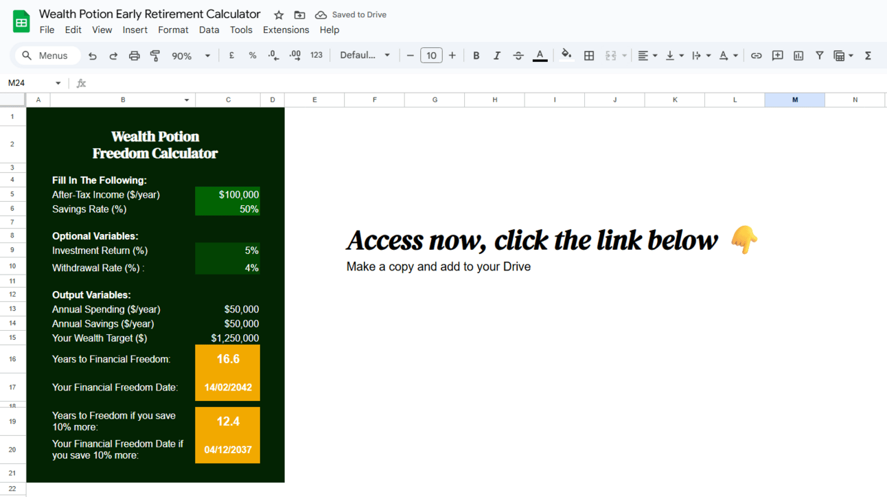 This concept was so life-changing to me that I wanted to create a simple tool that you can use to calculate your financial freedom date. Click here to access the Wealth Potion Early Retirement Calculator.